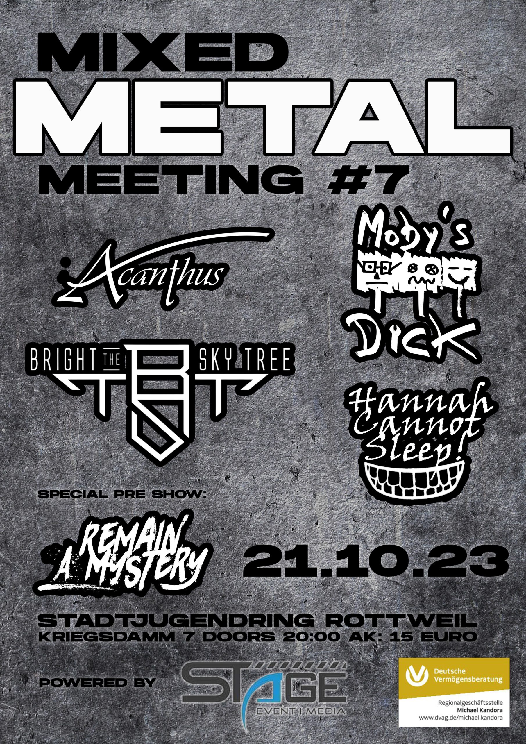 der Jugendring Rottweil veranstaltet zweimal jährlich das Mixed-Metal-Meeting. Wir freuen uns sehr, dass wir am 21. Oktober als letzter Gig des Abends auf der Bühne stehen werden. Wir freuen uns auf euch!